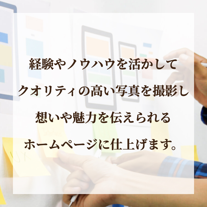 経験やノウハウを活かして、クオリティの高い写真を撮影し、想いや魅力を伝えられるホームページに仕上げます。